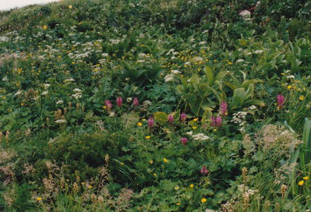 豪雪地帯のため残雪が多く、湿生や中生のお花畑を随所に作る。花の種類も多く、