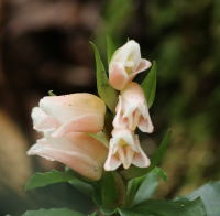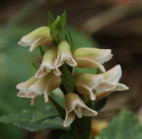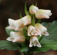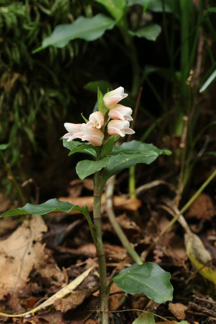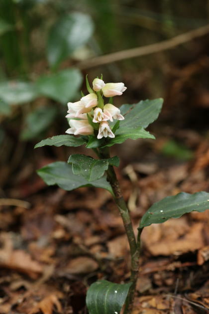 葉は疎らにつき、表面に緑色の筋が入り、花は茎頂に数個密に咲く。