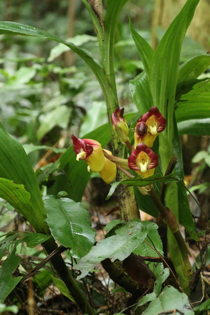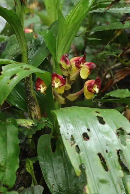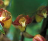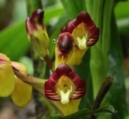 花は黄色から黄緑色で、蕚片と側花弁の先約半分が濃赤色