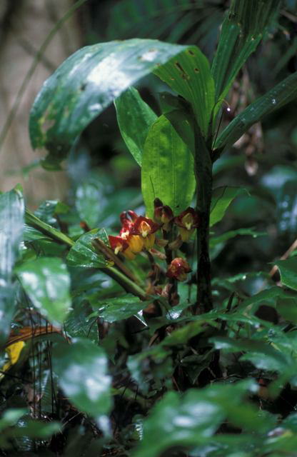 八重山諸島の常緑樹林下に生える。葉は大きな楕円形で普通5本の大脈