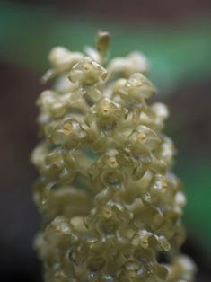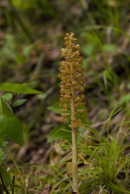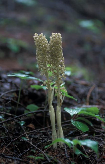 北海道から本州中部にかけて落葉樹林下に生える腐生ラン。