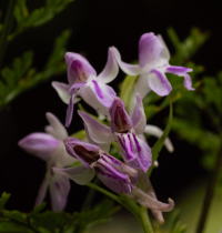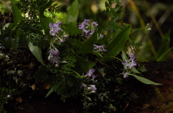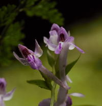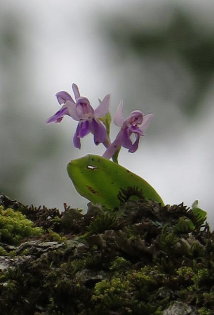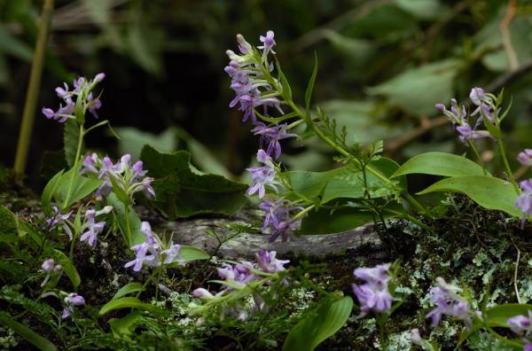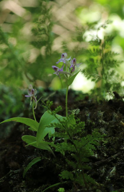 着生し、花は淡紅紫色で、背萼片と側花弁がカブト状に集まり、唇弁は3裂。