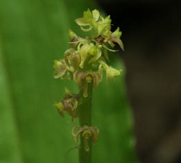 いに重なって4〜5枚つく。花の色は黄緑色で花茎の先に極く小さい花を密生させる。
