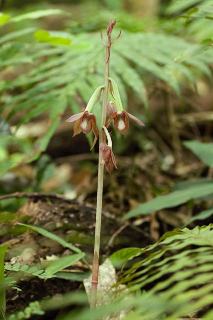 九州南部から沖縄にかけての林下や草原に生える腐生ラン。花茎の上部