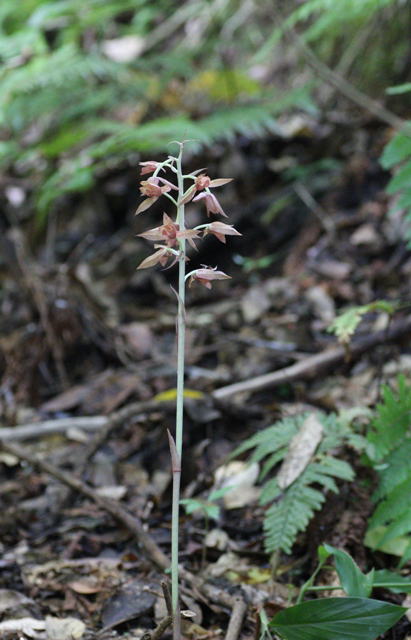 て赤褐色がら紫色。唇弁は黄白色でやや紫色を帯び、前方で浅く3裂する。