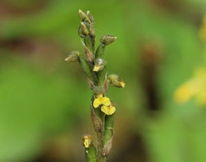 唇弁は黄色で先がT字形に拡がる。