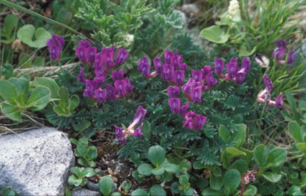暑寒別岳に特産する。花の色は紅紫で鮮やかで、旗弁が長く先がへこむ。暑寒別岳を代表する名花である。