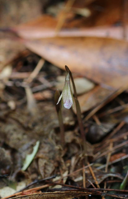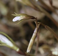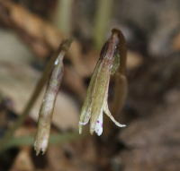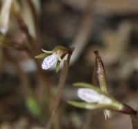 花茎の先に1個横向きに頭を下げた格好で咲く。唇弁は白く