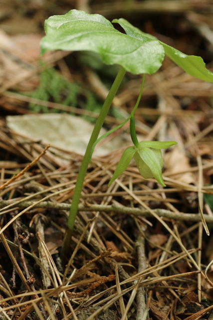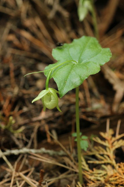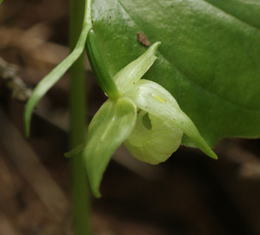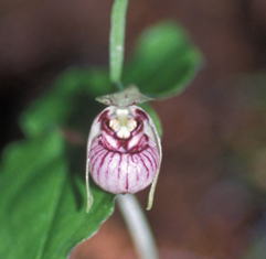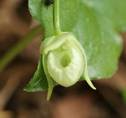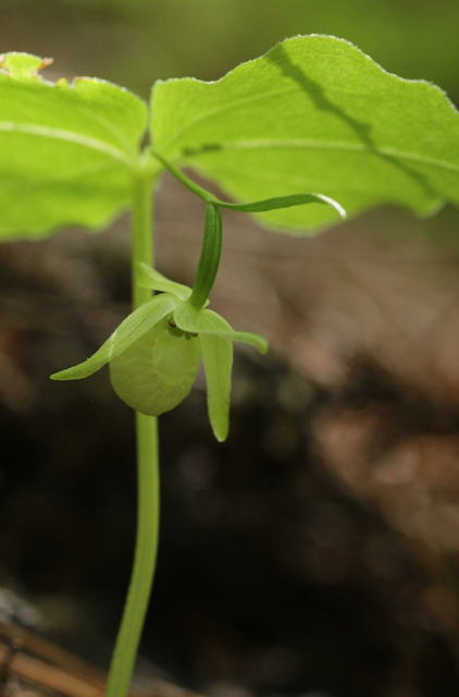 袋状の唇弁は薄緑色(白色に近い)で暗紅色の縦の