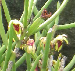 背萼片と側萼片は黄緑色で、唇弁は濃い赤紫色の斑紋があり、先端は2裂している。