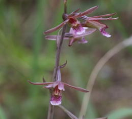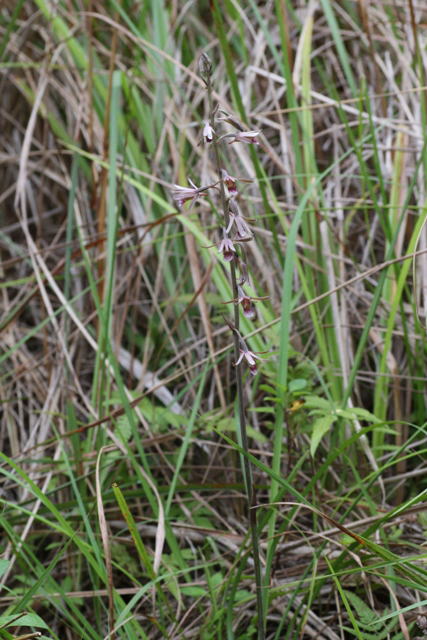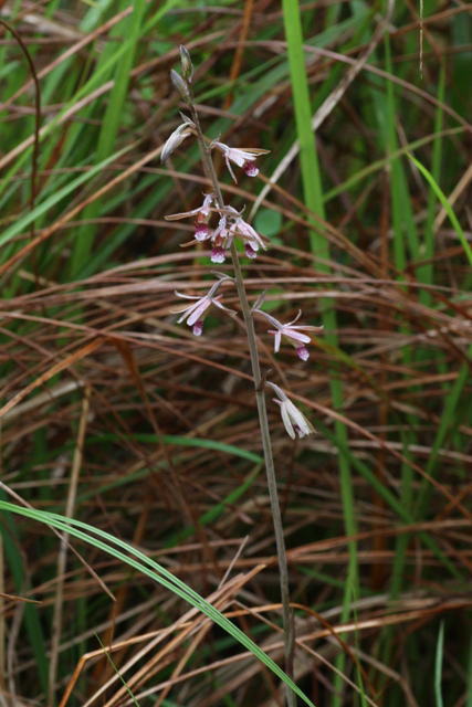 花は全開せず、総状花序にやや疎らにつく。唇弁