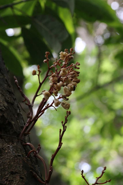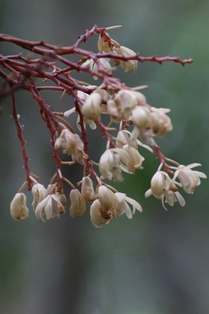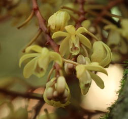 よじ登り、枝先に密に分枝しした花序が発達し多数の淡黄褐色の花をつける。