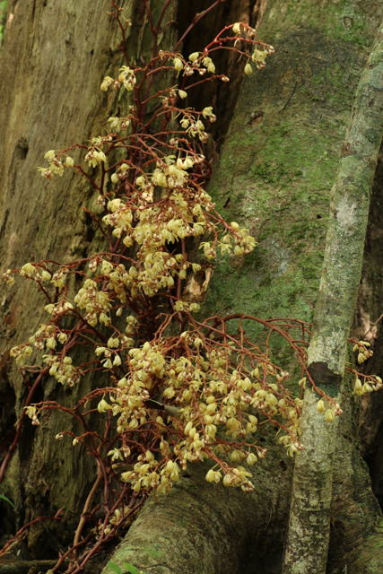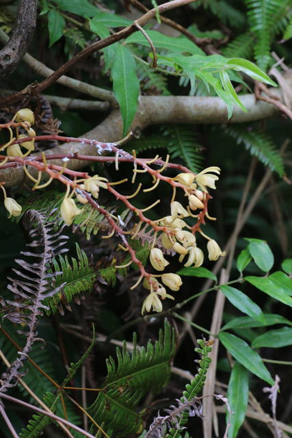 屋久島から沖縄にかけて分布する蔓性の腐生ラン。茎は赤褐色で木の幹を